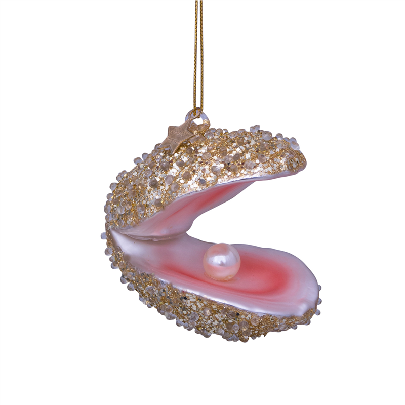 Ornamento in vetro a forma di ostrica con perla, misura 7 cm di altezza, presenta una raffinata combinazione di colori oro e rosa. Perfetto per aggiungere un tocco elegante e sofisticato alla decorazione, ideale per chi apprezza dettagli marini e tonalità delicate.