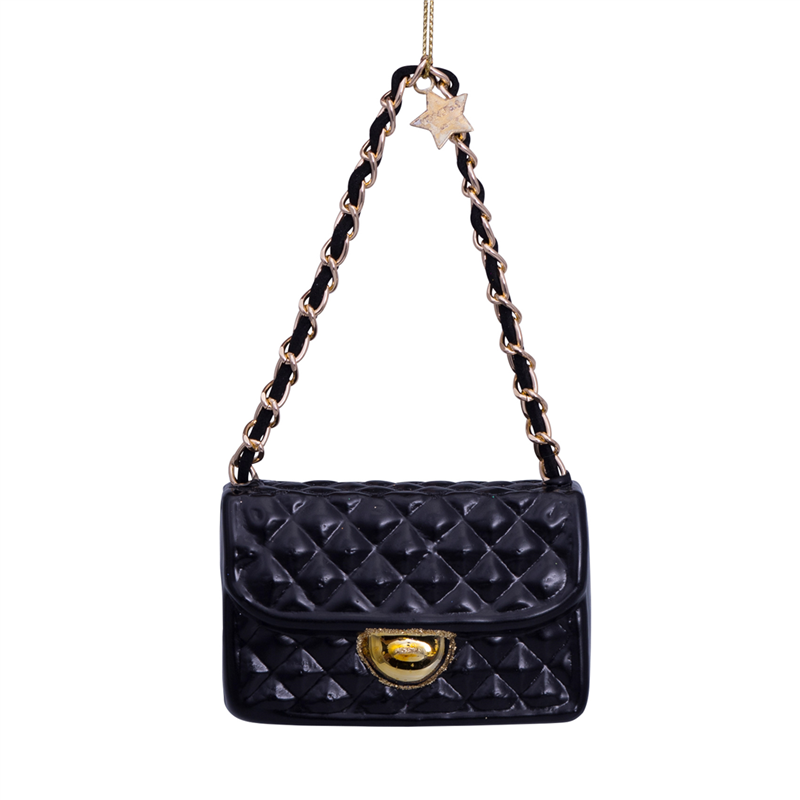 Ornamento in vetro a forma di borsa fashion, con dimensioni di 7 cm di altezza, caratterizzato da una combinazione di colori nero e oro. Perfetto per aggiungere un tocco di eleganza e stile al tuo albero di Natale o come decorazione raffinata per la casa durante le festività. Realizzato con attenzione ai dettagli, questo ornamento riflette una sensazione di lusso e moda.