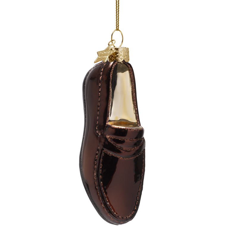 Ornamento in vetro a forma di mocassino, di colore marrone, con un'altezza di 12 cm. Design dettagliato e raffinato, ideale per decorare ambienti o l'albero di Natale con un tocco elegante e originale.