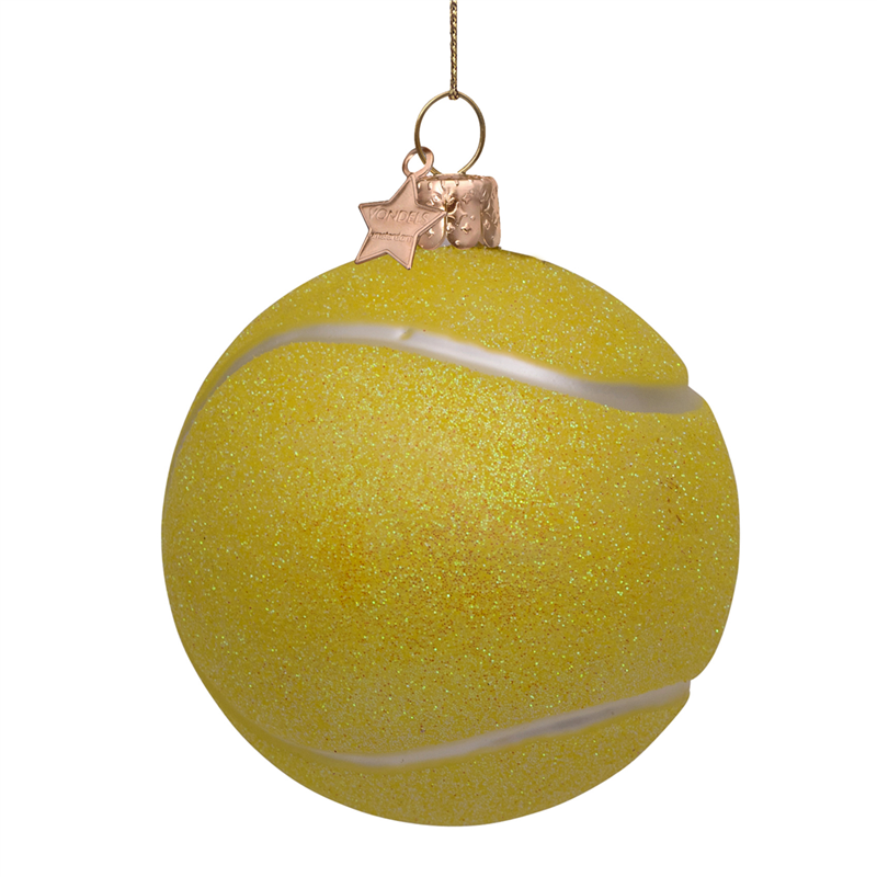 Ornamento in vetro a forma di pallina da tennis di colore giallo, ideale per aggiungere un tocco sportivo e originale alle decorazioni natalizie o per collezionisti di articoli sportivi unici. Realizzato con cura artigianale, presenta dettagli realistici e una finitura lucida, perfetta per abbellire l'albero di Natale o da esporre in vetrina.