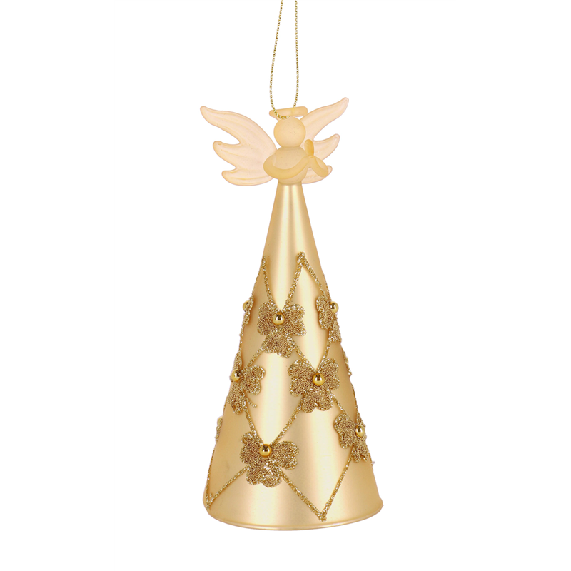 Ornamento in vetro dalla forma di angelo, caratterizzato da una finitura elegante in tonalità champagne e dettagli delicati. Ideale per aggiungere un tocco di raffinatezza e serenità all'arredamento natalizio o per collezionisti di decorazioni in vetro.