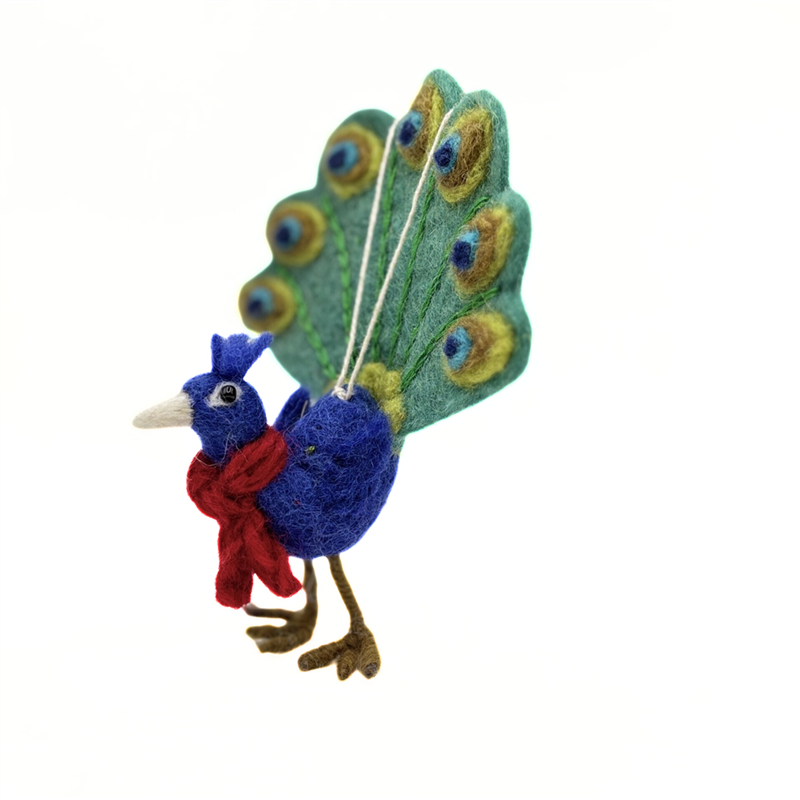 Ornamento in feltro a forma di pavone, decorato con una sciarpa colorata. Realizzato artigianalmente con materiali di alta qualità, questo ornamento è perfetto per aggiungere un tocco di eleganza e originalità alla tua decorazione. Ideale per essere appeso o esposto in vari ambienti della casa.