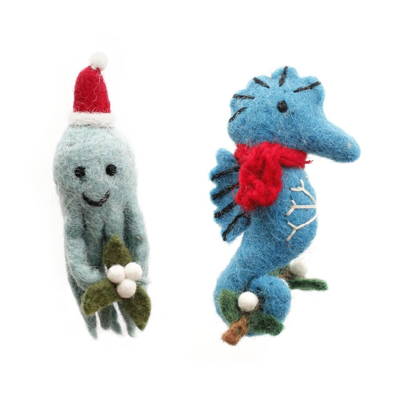 ornamento in feltro a forma di polipo/cavalluccio marino, realizzato a mano con dettagli accurati. perfetto per decorare ambienti marini o aggiungere un tocco di fantasia e colore a qualsiasi spazio. realizzato con materiali di alta qualità, garantisce durata e un aspetto artigianale unico. ideale come regalo o per collezionisti di oggetti marini. disponibile in diverse tonalità per adattarsi a vari stili di arredamento.