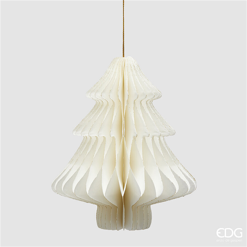 Ornamento elegante in carta origami, a forma di albero, con altezza di 15 cm e diametro di 13 cm, di colore bianco, realizzato da Edg - Enzo De Gasperi. Perfetto per decorazioni natalizie sofisticate e moderne.
