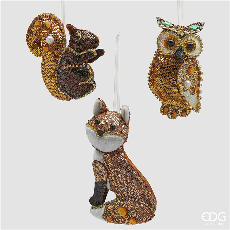 ornamento tessuto raffigurante animali del bosco, alto 12 cm, arricchito con strass di colore marrone, della collezione edg - enzo de gasperi.