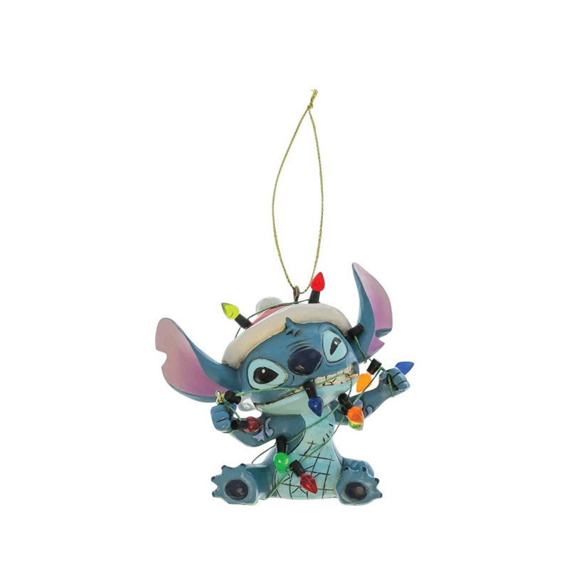 Ornamento raffigurante Stitch avvolto in luci natalizie, parte della collezione Jim Shore Disney Traditions per Enesco, realizzato in resina dipinta a mano con dettagli intricati e colori vivaci.
