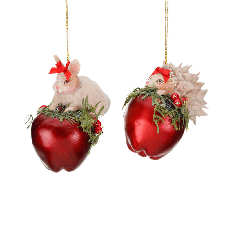 Ornamento festivo di 12 cm raffigurante un coniglio e un riccio con fiocco, posizionati su una mela. I colori predominanti sono il rosso, il bianco e il verde, rendendolo un'aggiunta perfetta per decorazioni natalizie o tematiche stagionali.