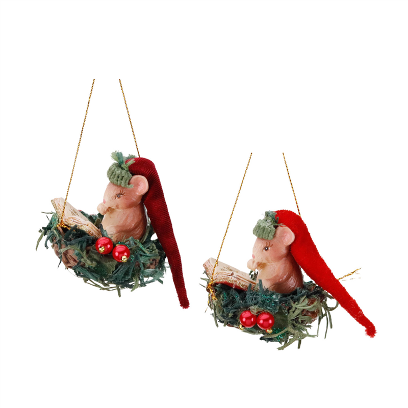 ornamento natalizio raffigurante un topolino seduto in un nido con un libro, realizzato con cura in resina e dipinto a mano. misura 7 cm di altezza e presenta una combinazione di colori verde e rosso, ideale per aggiungere un tocco di magia e calore alla decorazione del tuo albero di natale. perfetto per chi ama dettagli unici e raffinati nella propria collezione di ornamenti festivi.