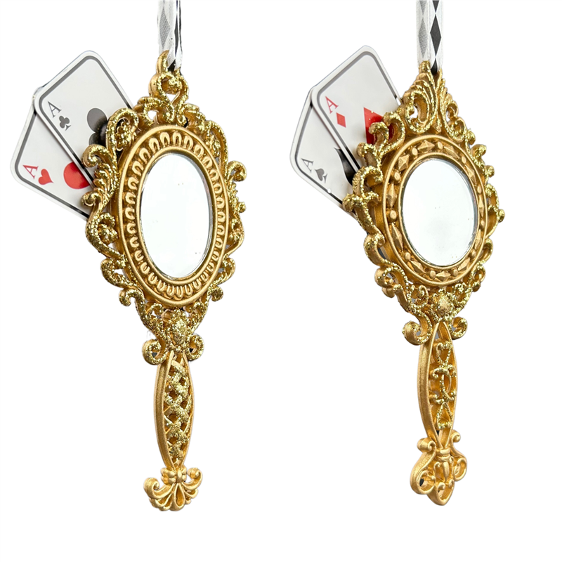 Ornamento specchio decorativo con carte da gioco in finitura dorata, ideale per aggiungere un tocco di eleganza e originalità al tuo ambiente. Perfetto per chi ama il gioco e l'estetica raffinata, questo pezzo unisce funzionalità e design in un unico accessorio distintivo.