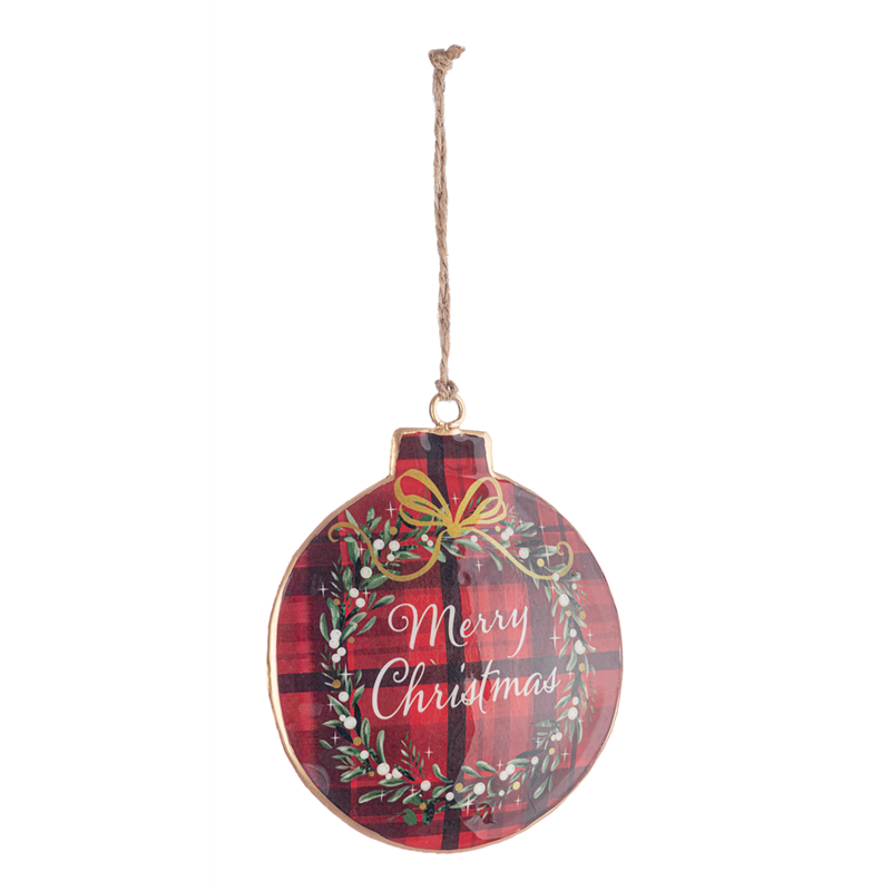 Ornamento a forma di sfera realizzato in metallo, con un design elegante caratterizzato dai colori rosso e nero. Il motivo "Merry Christmas" aggiunge un tocco festivo e moderno, ideale per decorare l'albero di Natale o altri ambienti durante le festività. Perfetto per chi ama un mix di tradizione e contemporaneità nel proprio arredamento natalizio.