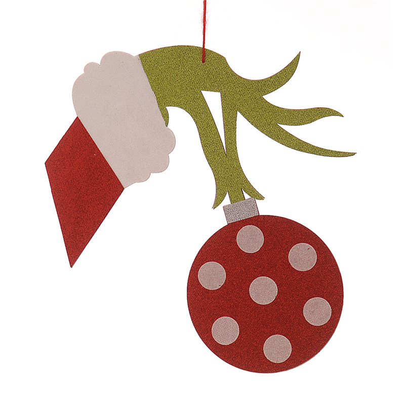 Ornamento natalizio ispirato alla mano del Grinch, realizzato con dettagli accurati e colori verde e rosso. La mano afferra una sfera glitterata che aggiunge un tocco di brillantezza e magia natalizia. Perfetto per decorare l'albero o come elemento distintivo per la casa durante le festivit�.