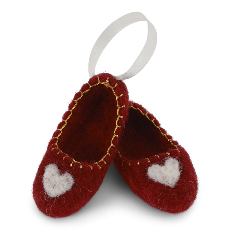Ornamento in feltro a forma di scarpe ballerine rosse, caratterizzato da un delicato cuore bianco applicato come dettaglio decorativo. Perfetto per aggiungere un tocco di eleganza e colore a qualsiasi ambiente o albero di Natale. Realizzato con attenzione ai dettagli e materiali di alta qualità, questo ornamento unisce tradizione e stile contemporaneo.