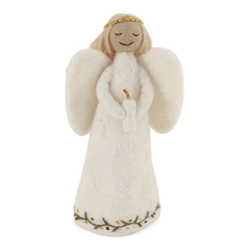 Ornamento natalizio in lana a forma di angelo con candela, realizzato a mano. L'angelo è curato nei dettagli, con ali delicate e una candela simbolica tra le mani, perfetto per decorare l'albero di Natale o come elemento decorativo in casa durante le festività. Realizzato con materiali di alta qualità, offre un tocco di eleganza e tradizione artigianale.