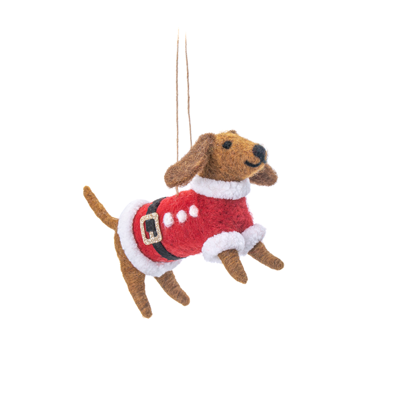 Ornamento in feltro a forma di cane bassotto con tema natalizio, alto 8 cm. Il cane è decorato con un cappello di Babbo Natale rosso e dettagli marroni. Perfetto per aggiungere un tocco festivo e giocoso alle decorazioni natalizie.