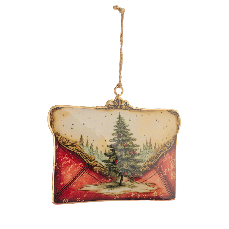 ornamento in metallo a forma di letterina con design natalizio, caratterizzato da tonalità argilla, rosso e verde. perfetto per decorare ambienti durante le festività, aggiungendo un tocco di eleganza e colore.