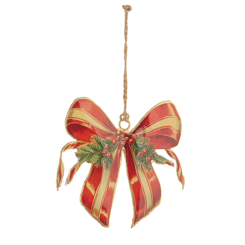 Ornamento in metallo con design a forma di fiocco, caratterizzato da una combinazione di colori rosso moody e oro. Questo pezzo aggiunge un tocco elegante e festoso a qualsiasi ambiente, ideale per decorazioni natalizie o per arricchire spazi con un tocco di raffinatezza.
