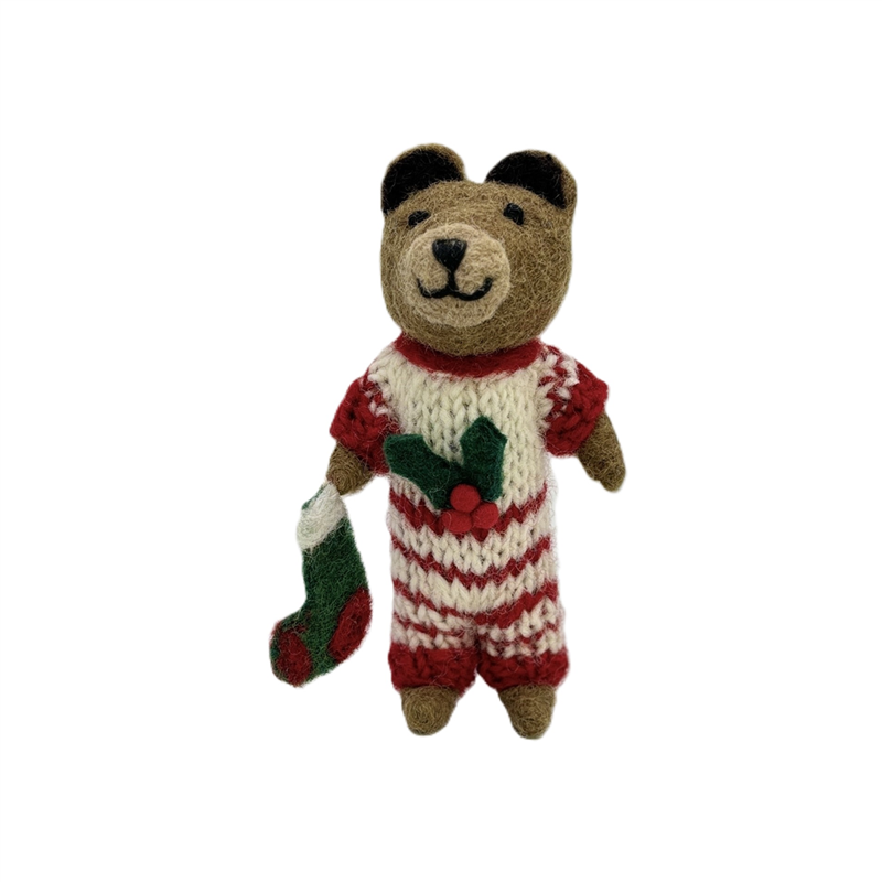 Ornamento in feltro a forma di orsetto vestito per Natale, alto 12 cm. I colori principali sono rosso, verde e bianco, ideali per decorare l'albero o aggiungere un tocco festivo alla casa.