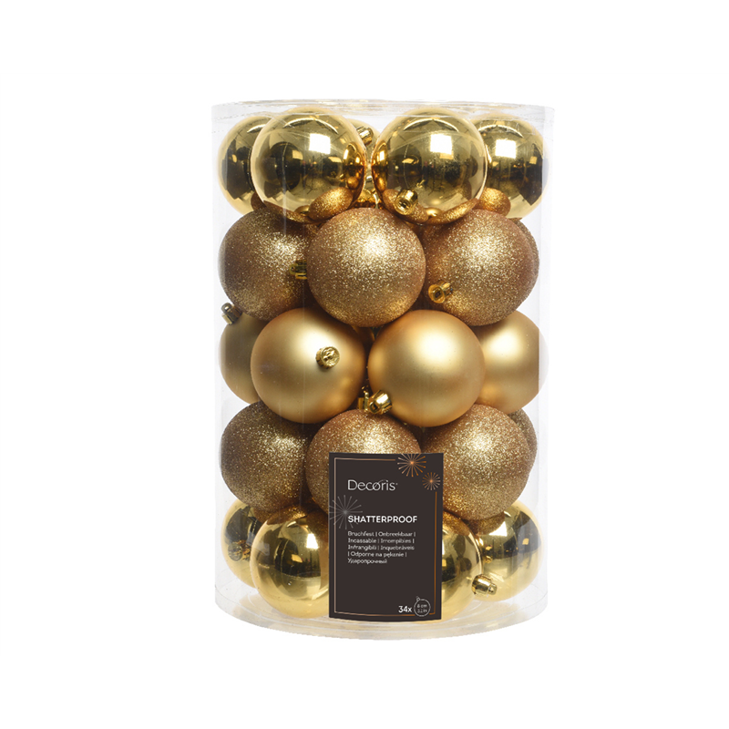 Sfera decorativa in PVC con diametro di 8 cm, disponibile in un set da 34 pezzi. La finitura è un mix di opaca, lucida e glitterata, nel colore oro chiaro. Prodotto da Decoris.