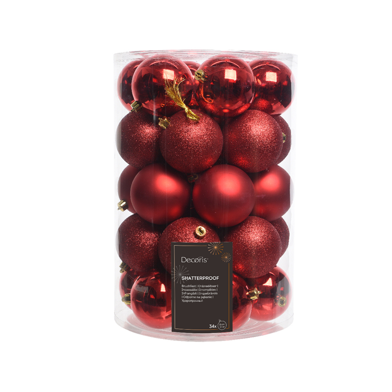 Set di 34 sfere natalizie da 8 cm in PVC, finiture miste opache, lucide e glitterate, colore rosso natalizio, marca Decoris.
