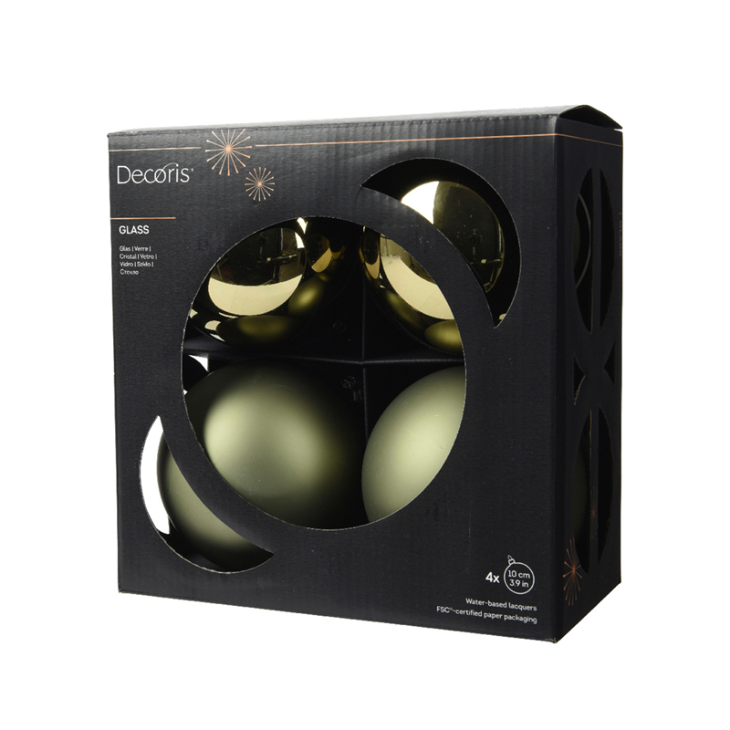Set di 4 sfere in vetro dal diametro di 10 cm, caratterizzate da una finitura mista di superfici opache e lucide. Il colore "Rosemary Green" offre una tonalità verde rosmarino sofisticata, ideale per decorazioni eleganti e moderne. Prodotte da Decoris, queste sfere sono perfette per arricchire l'albero di Natale o per altre decorazioni festive.