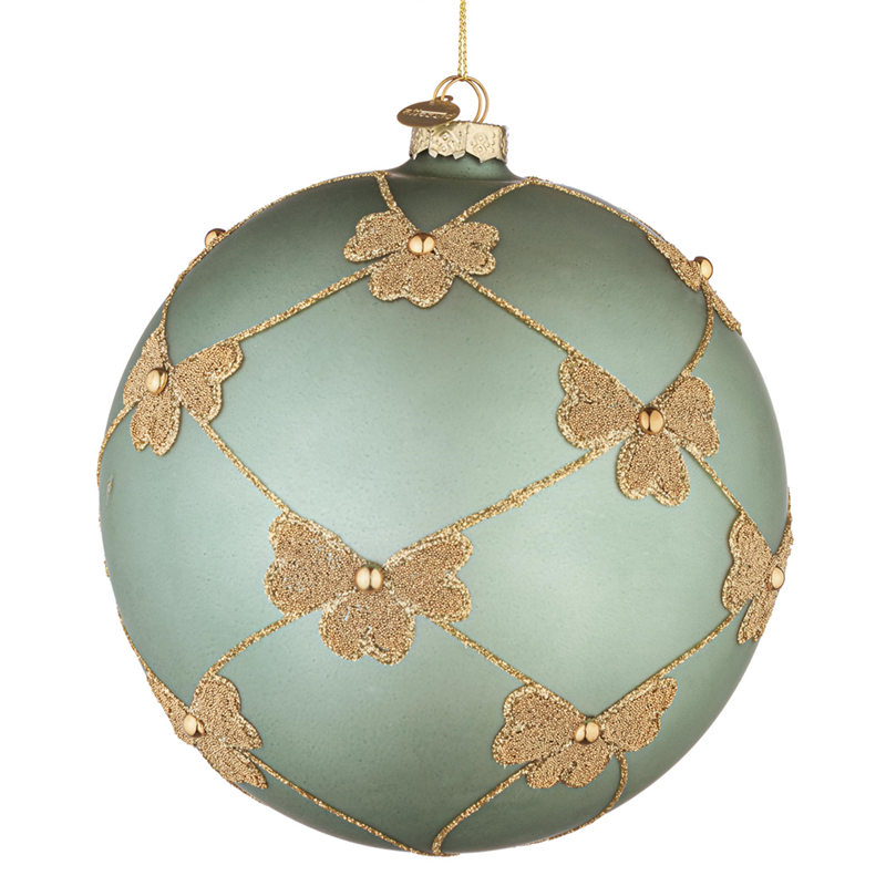 La sfera in vetro con un diametro di 15 cm presenta un design elegante e raffinato, con una superficie "flock" arricchita da fiocchi che evocano un'atmosfera invernale. La colorazione "Water Green" si combina armoniosamente con dettagli dorati, creando un effetto visivo sofisticato e lussuoso, ideale per decorare ambienti durante le festività o per aggiungere un tocco di classe tutto l'anno.