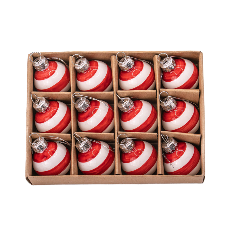 Set di 12 sfere decorative in vetro con un diametro di 3 cm ciascuna, caratterizzate da un elegante design a strisce rosse e bianche. Perfette per aggiungere un tocco festivo e raffinato a qualsiasi ambiente o decorazione natalizia.