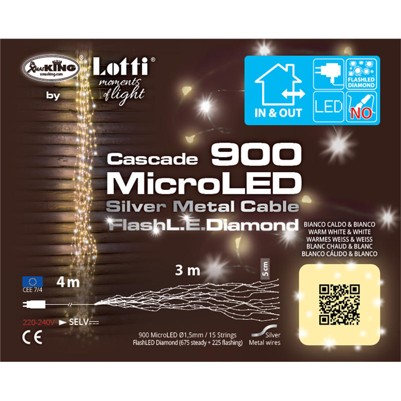 cascata h300cm 900 microled traditional ø1,5mm, 15 stringhe, gioco di luce automatico flashled diamond (675 led traditional a luce fissa + 225 led traditional con lampeggio lento), trasformatore bassa tensione di sicurezza, uso esterno e interno, cavo metallo rame metal copper, dimensioni 4+3m