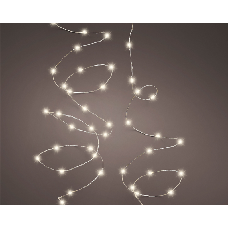 Filo di luci a LED con 100 micro LED a luce bianco caldo, lungo 495 cm. Funzionamento a batteria con tecnologia Durawise per un'illuminazione efficiente e duratura. Cavo di colore argento, adatto per decorazioni interne ed esterne.