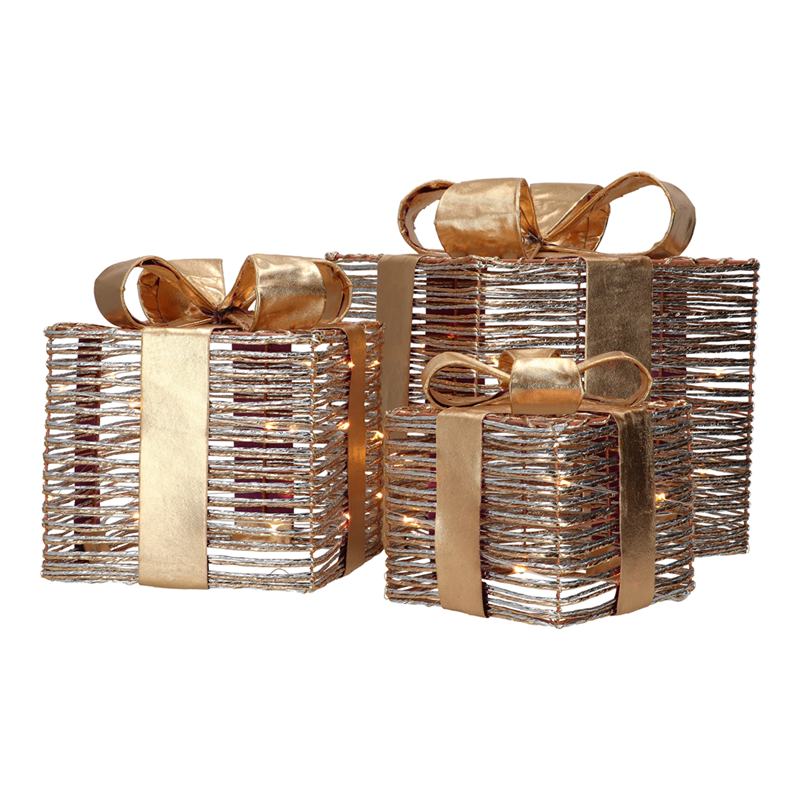 Il Pacco Dono Oro Glitter Con Led 3pz della Selezione Vertecchi è un elegante set di tre pacchi decorativi, ciascuno rivestito con una brillante finitura oro glitterata. Ogni pacco è dotato di illuminazione a LED integrata, creando un effetto luminoso e festoso ideale per arredare la tua casa durante le festività. Perfetti da posizionare sotto l'albero o come centrotavola, questi pacchi dono aggiungono un tocco di magia e raffinatezza alla tua decorazione natalizia.