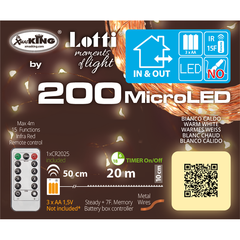 Catena luminosa composta da 200 micro LED a luce bianco caldo, ideale per decorazioni natalizie. La lunghezza totale è di 20,5 metri, con 0,5 metri di cavo aggiuntivo. Funziona a batteria, permettendo un posizionamento flessibile senza necessità di prese elettriche. Il cavo in rame conferisce un aspetto elegante e discreto, perfetto per creare atmosfere accoglienti e festive.