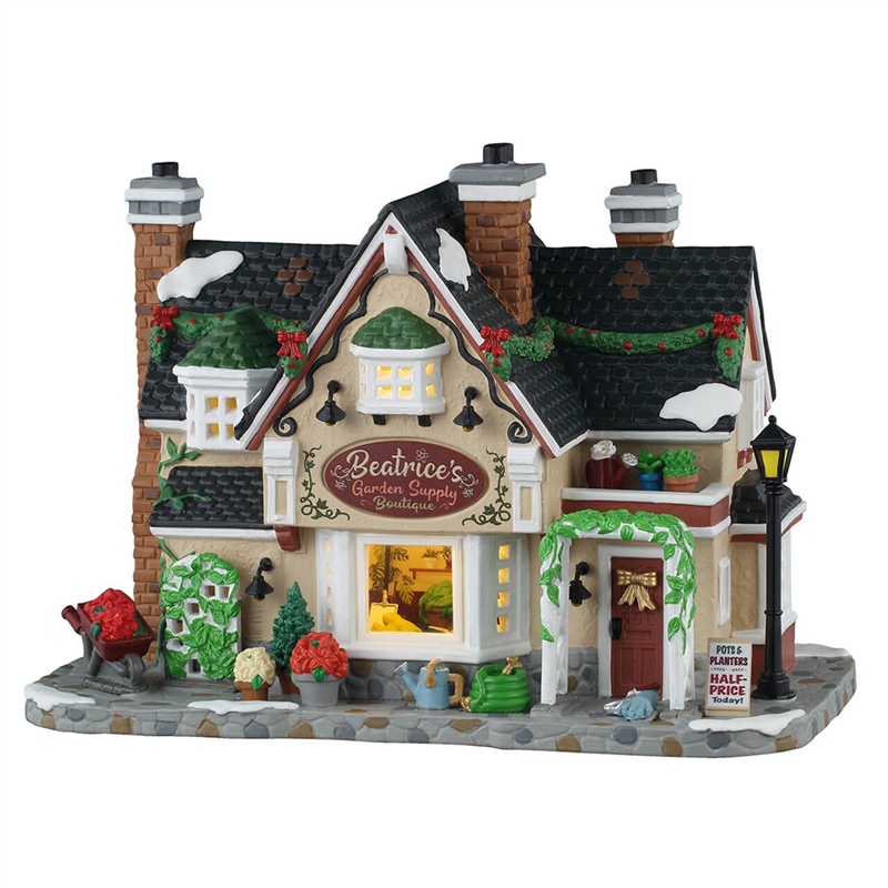 La F599 Beatrice's Garden Supply Boutique di Lemax è un'incantevole struttura in miniatura perfetta per arricchire il tuo villaggio natalizio. Questo negozio specializzato offre una vasta gamma di forniture per il giardinaggio, presentato con dettagli realistici e colori vivaci. L'edificio è caratterizzato da un'architettura pittoresca con vetrine ricche di accessori da giardino, piante e attrezzi in miniatura. È una scelta ideale per creare un'atmosfera accogliente e affascinante nel tuo display festivo.