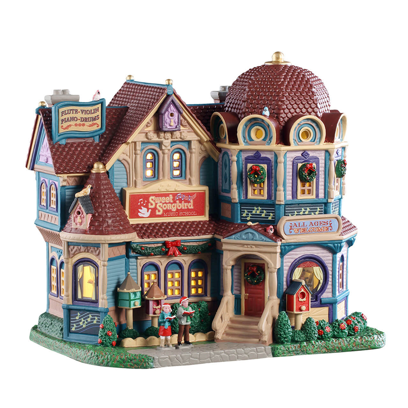 La F604 Sweet Songbird Music School di Lemax è una deliziosa scuola di musica in miniatura, caratterizzata da un'architettura affascinante e dettagli curati. La struttura è decorata con elementi natalizi, come ghirlande e luci festose, e presenta un'insegna con note musicali. Gli studenti e gli insegnanti, rappresentati da figurine, animano la scena mentre si preparano per il concerto di Natale. La scuola è dotata di finestre illuminate che offrono una vista sugli interni, dove si intravedono strumenti musicali e spartiti. Questo pezzo è ideale per arricchire un villaggio natalizio in miniatura, aggiungendo un tocco di armonia e gioia musicale.