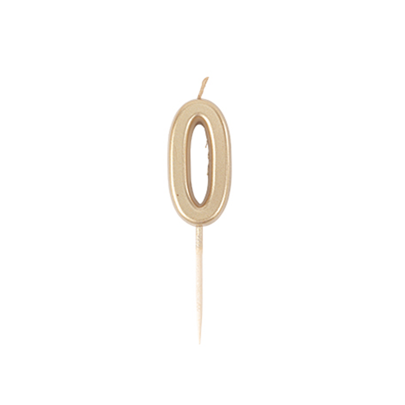 Candelina per torta a forma di numero "0" in colore oro metallico, con un'altezza di 4.5 cm, prodotta da Artyfetes Factory.