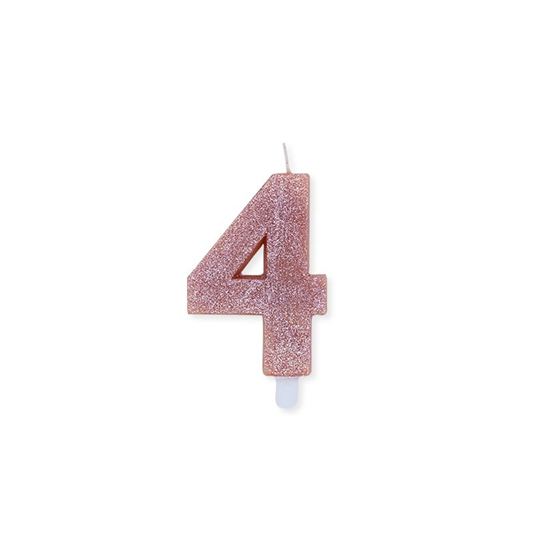 Candela a forma di numero 4, di colore rosa con glitter, ideale per feste di compleanno o celebrazioni. Perfetta per aggiungere un tocco di luminosità e colore alla tua torta.