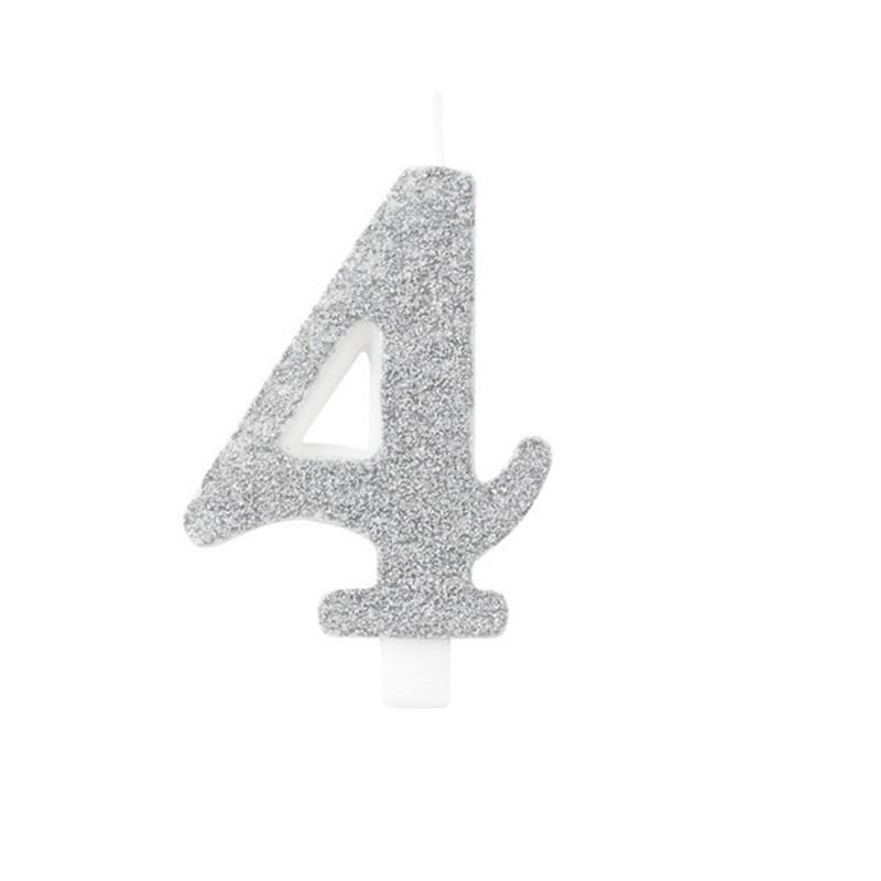 Candela per torta a forma di numero, colore argento, con finitura glitter bio, altezza 9,5 cm, ideale per festeggiare compleanni e anniversari. Prodotto da Givi Italia Srl, combina eleganza e sostenibilità.