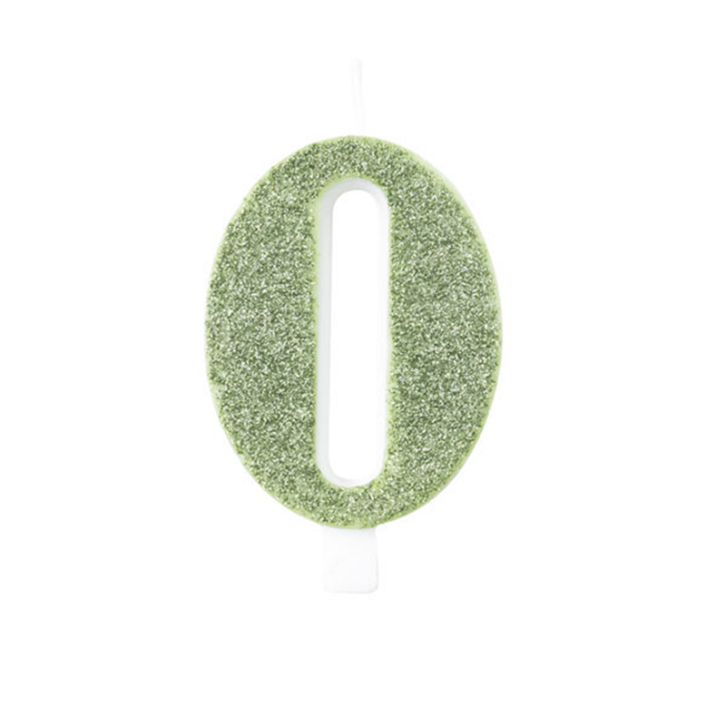 Candela per torta a forma di numero realizzata in materiale biologico, decorata con glitter ecologici. Altezza di 9,5 cm, color salvia. Prodotta da Givi Italia Srl.