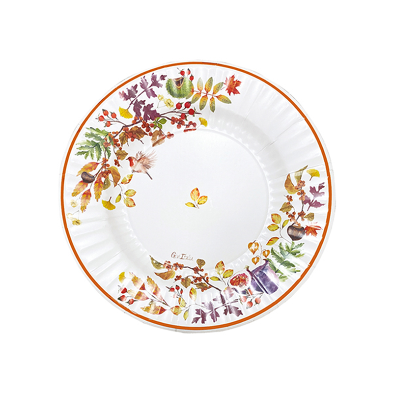 Set di 8 piatti di carta dal diametro di 21 cm con design autunnale "Hello Fall", ideali per decorare la tavola in occasione di feste stagionali.