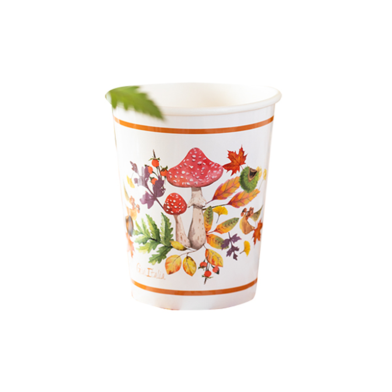 Bicchiere di carta con capacità di 250 cc, decorato con un tema autunnale "Hello Fall". Confezione da 8 pezzi.