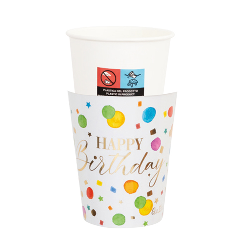 Bicchieri di carta da 250 cc, confezione da 8 pezzi, decorati con tema "Happy Birthday", ideali per feste di compleanno.