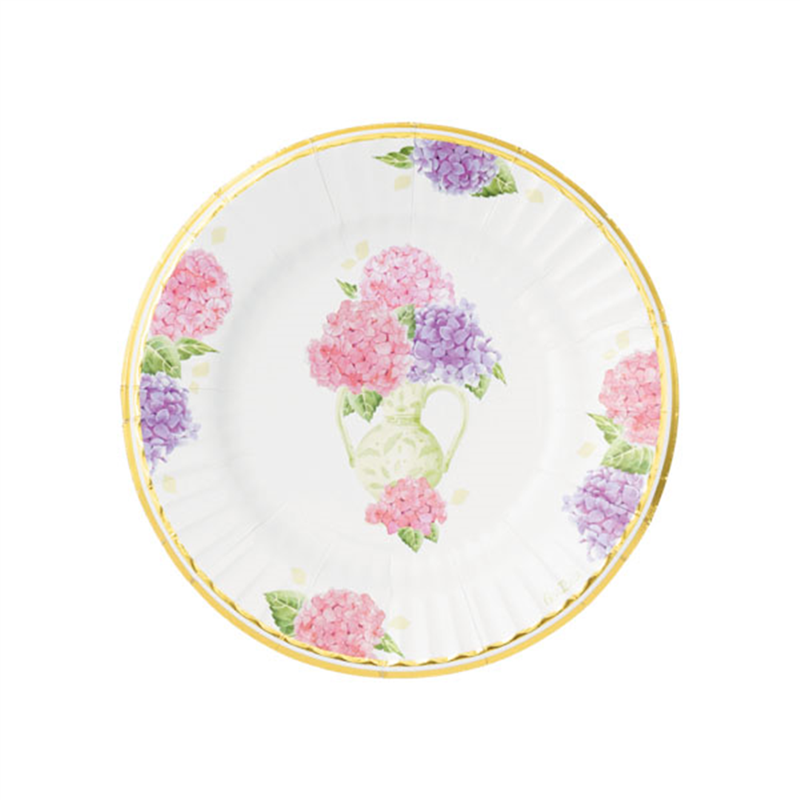 Piatti di carta da 21 cm decorati con eleganti motivi di ortensie, ideali per feste e occasioni speciali. Confezione da 8 pezzi.