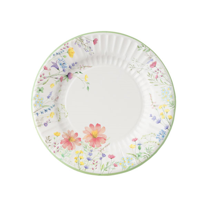 Piatto di carta da 21 cm, confezione da 8 pezzi, decorato con un tema floreale "Il Giardino", ideale per feste e occasioni speciali.