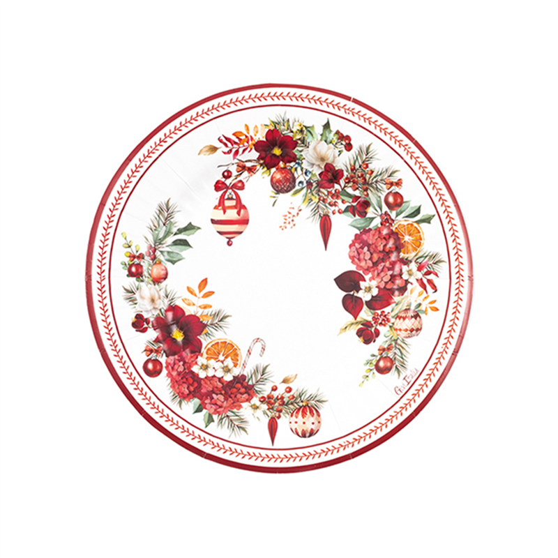 Piatti in carta dal diametro di 21 cm, decorati con un elegante motivo natalizio "Christmas Bouquet". La confezione contiene 8 pezzi, ideali per arricchire la tua tavola durante le festività natalizie con stile e praticità. Perfetti per un'atmosfera festosa e accogliente.
