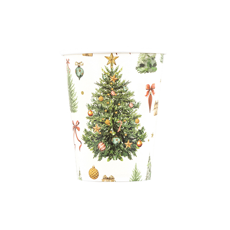 Set di 8 bicchieri di carta con capacità di 250 cc, decorati con un tema natalizio ispirato alla foresta di Natale. Perfetti per feste e celebrazioni durante la stagione delle festività.