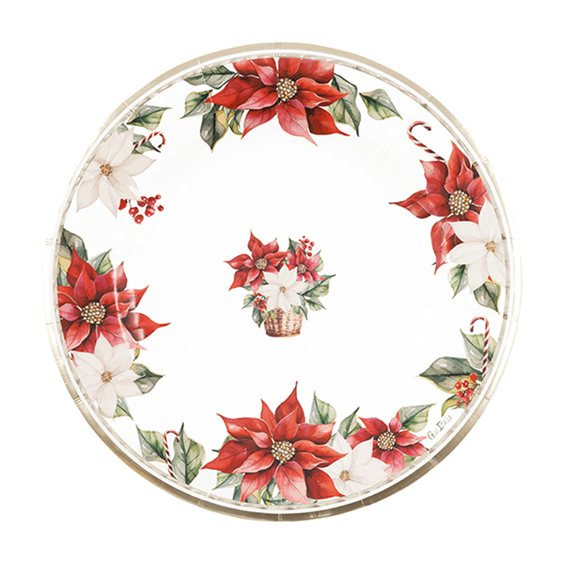 Set di 8 piatti di carta natalizi da 27 cm decorati con eleganti motivi di Stella di Natale, ideali per arricchire la tua tavola durante le festività.