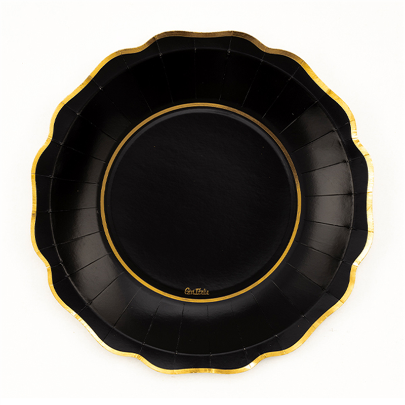 Set di 8 piatti di carta da 27 cm, decorati con un elegante bordo oro, design Liberty in oro e nero.