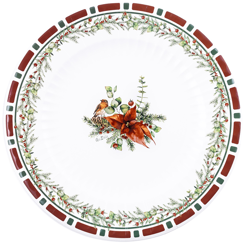Set di 6 sottopiatti in carta, diametro 33 cm, decorati con eleganti motivi natalizi. Perfetti per arricchire la tavola durante la cena della Vigilia di Natale.