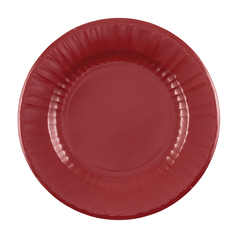 Piatto di carta rotondo con un diametro di 27 cm, disponibile in confezioni da 8 pezzi, prodotto da Givi Italia Srl. Colore Bordeaux, ideale per eventi e feste.