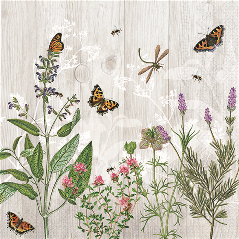 Tovagliolo in carta 33x33 cm decorato con motivi di giardino di erbe, ideale per arricchire la tavola con un tocco naturale e fresco. Perfetto per occasioni speciali o pasti quotidiani, aggiunge eleganza e stile con il suo design raffinato e dettagliato.