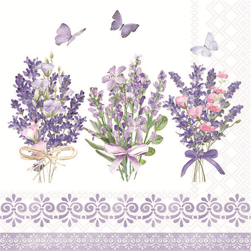 Tovagliolo 33x33 cm in carta decorato con motivo Lovely Lavender su sfondo bianco, ideale per aggiungere un tocco elegante e raffinato alla tua tavola. Perfetto per occasioni speciali o per un uso quotidiano che richiede un tocco di stile.