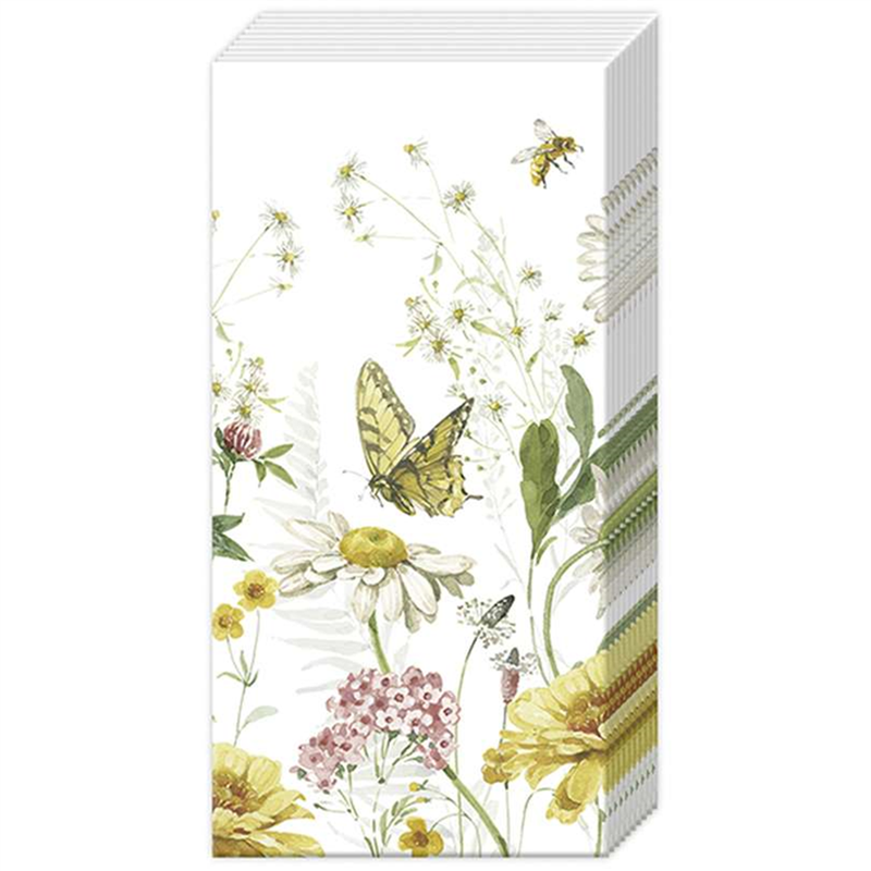 Fazzoletti in carta di alta qualità decorati con un vivace motivo di fiori di campo e farfalle, ideali per aggiungere un tocco di eleganza e colore a ogni occasione.